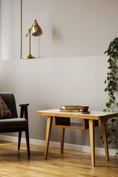 フリーランサーのためのスタイリッシュなオープンスタジオで北欧の自然のインテリアソファ 黒い壁 オフィススペースでデスクと黒のアクセント の写真素材 画像素材 Image