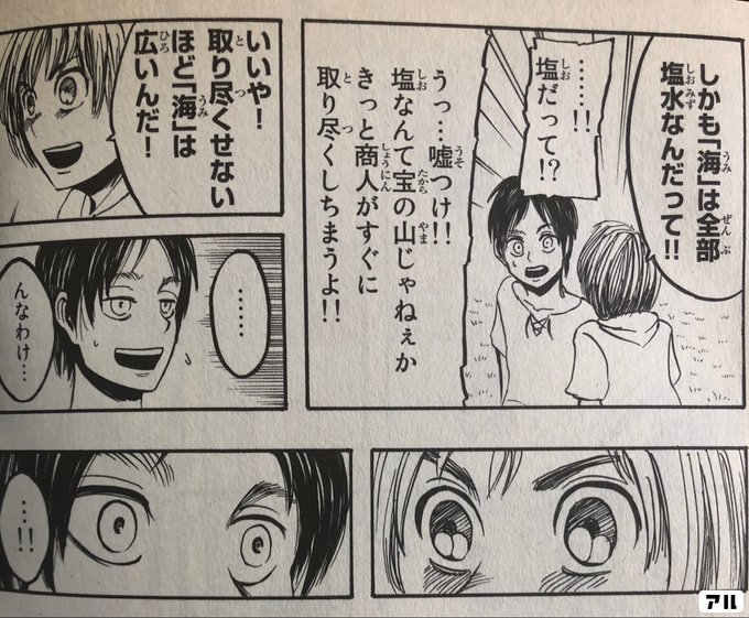 しかも 海 は全部塩水なんだって 塩だって うっ 嘘つけ 塩なんて宝の山じゃねぇか きっと商人がすぐに取り尽くしちまうよ いいや 取り尽くせないほど 海 は広いんだ んなわけ 進撃の巨人 アル