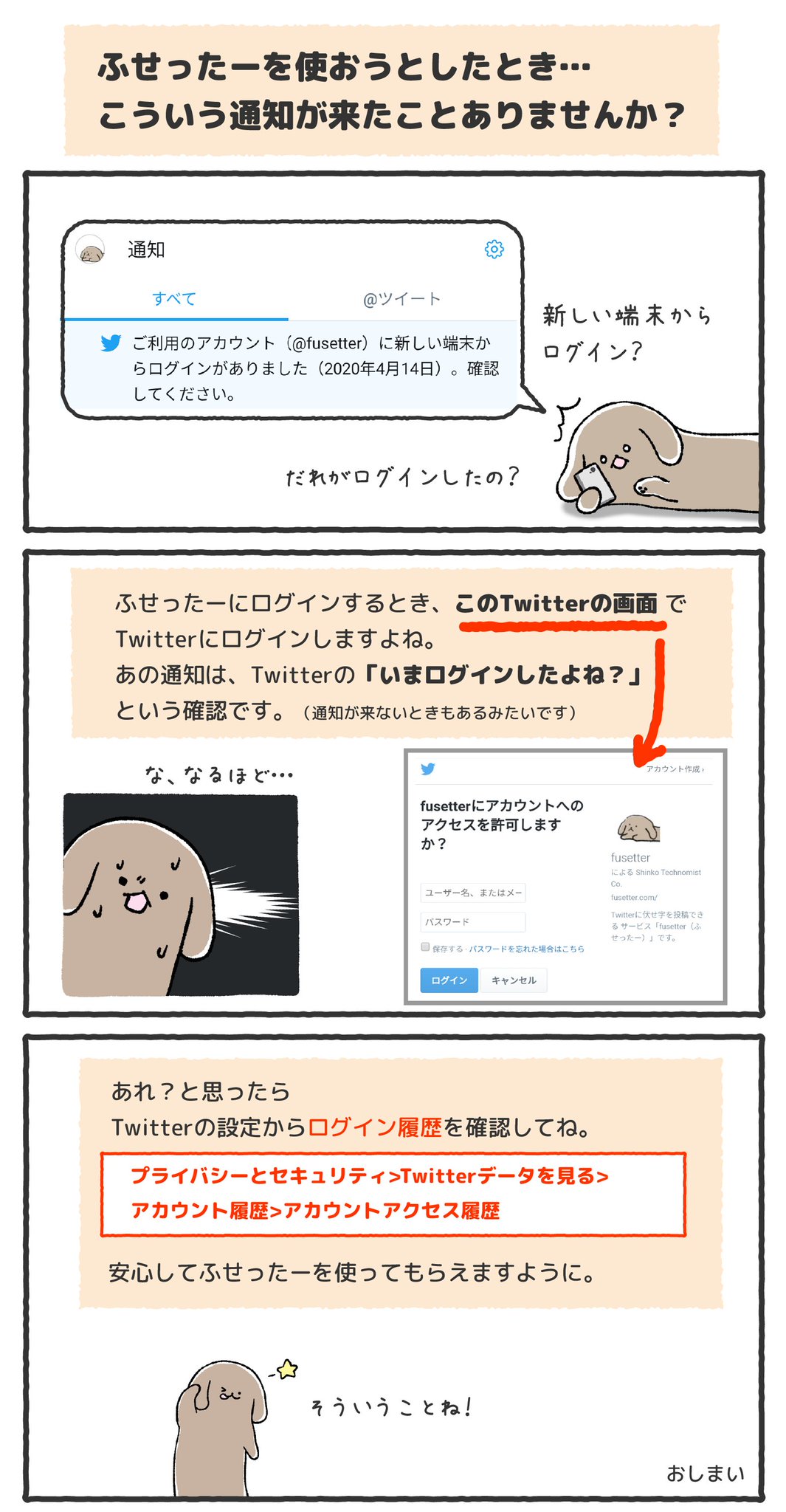 伏せ太 ふせったー公式 プライズ第2弾 ふせったーにログインするとき 新しい端末からログインがありました という通知が来る時があります 不安に感じる方もいるようなので ログイン履歴の確認方法のおしらせです 安心してふせったーを使って