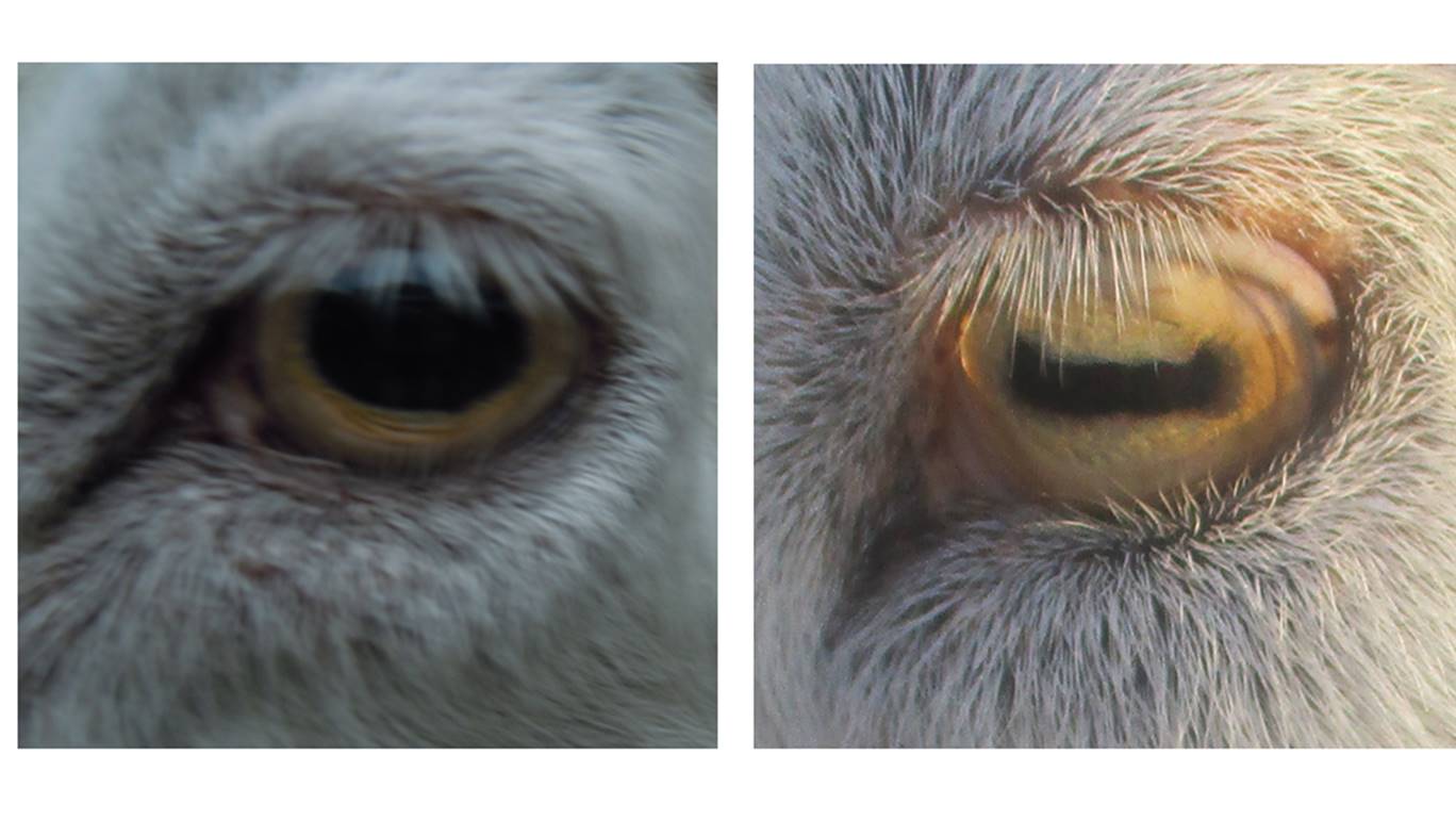 ほっと行動学 ヤギの目の瞳孔はこれだけ変化する 拡大したとき 左 は 暗くても多くの光を取り入れることができる つまり ヤギは夜でも外界が見えているの だ